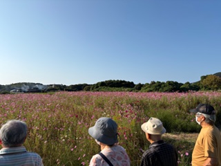 10月の外出プログラムはコスモス見学に行きました。満開のコスモス畑の周りをご利用者皆様で散策しました。道中にあるコスモス畑ではコスモスを持って帰れる為、お土産もありました。